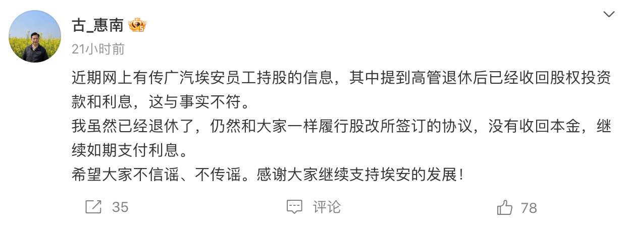 广汽埃安发现网络上有部分自媒体发布关于广汽埃安员工持股的不实信息,感谢大家持续支持埃安的事业发展!并进行恶意诋毁和传播,关于广汽埃安员工股权激励计划,在网上流传一篇匿名帖文指出,
