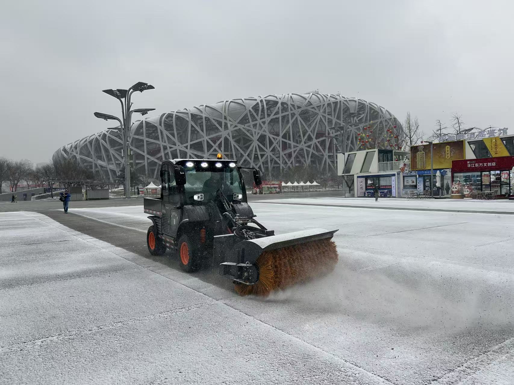 北京环卫集团旗下的各单位积极参与了模拟的清扫工作。步道除雪机等);此外还配备了人工推雪铲及扫把工具,