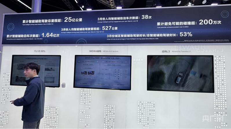 华为展位的宣传标语由记者董楠拍摄。在宣传中将L2级辅助驾驶包装成“高阶智驾”、德赛西威执行副总裁、