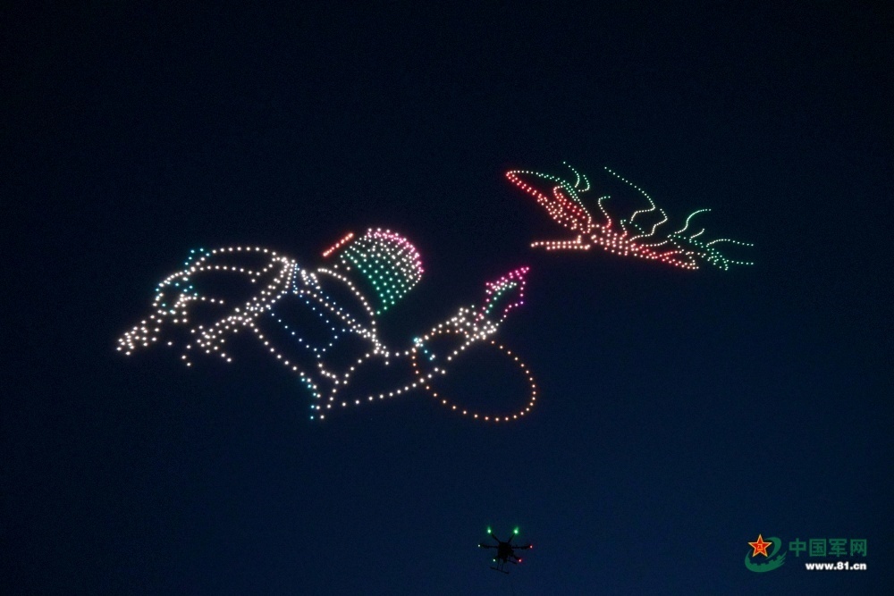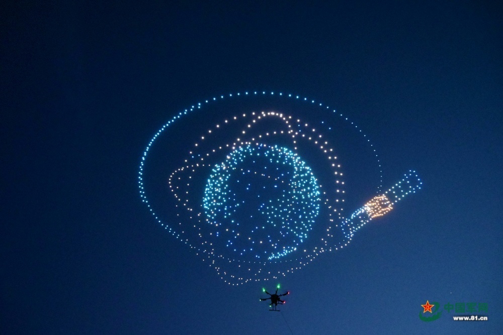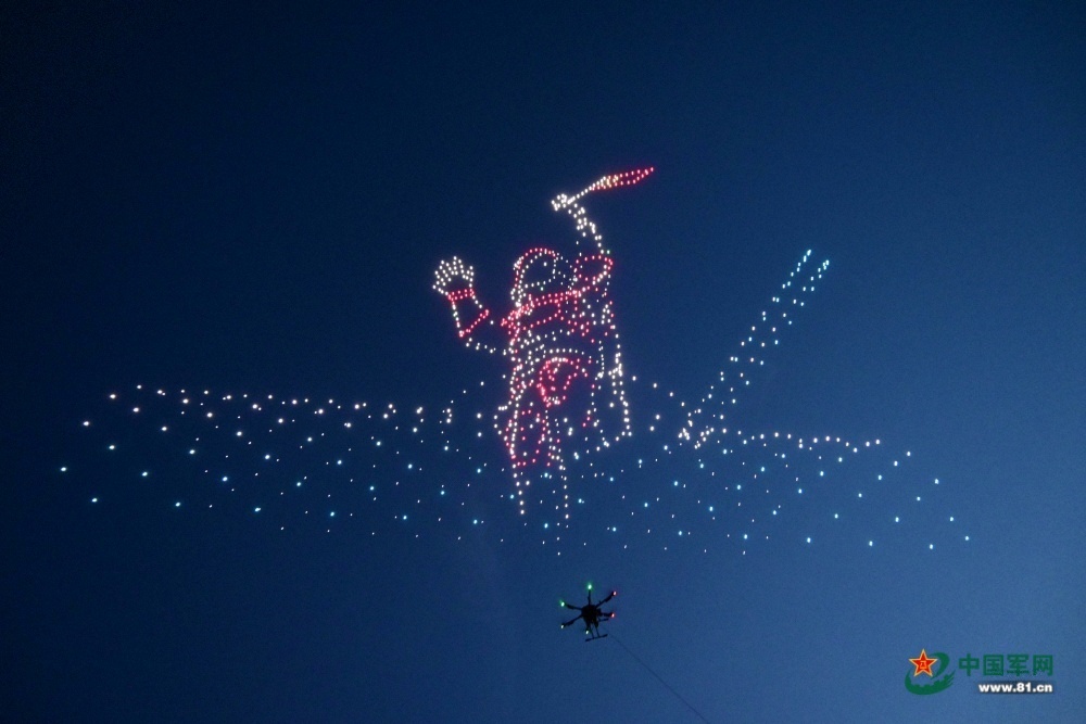 无人机编队重现了翟志刚在太空行走的亮东场景。(王粲摄)