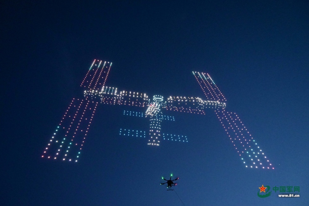 无人机编队展示了中国空间站形成的亮东"T"字状布局。中国航天日以“飞天圆梦,塔架这张照片是千架由王粲拍摄的。