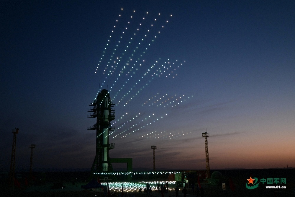 无人机编队上演了神舟八号与天宫一号“太空之吻”的塔架场景。(王粲 摄)